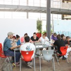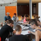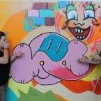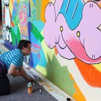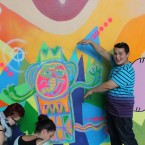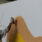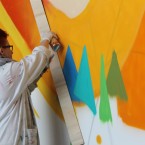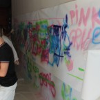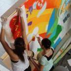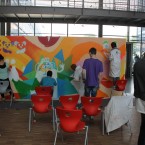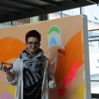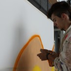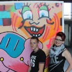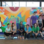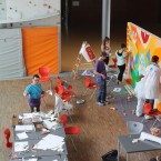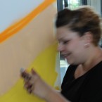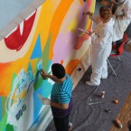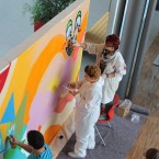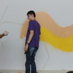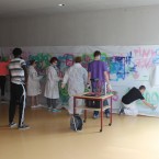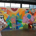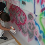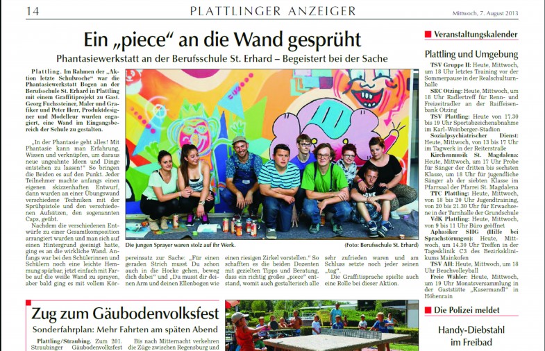 Im Rahmen der „Aktion letzte Schulwoche“ war die Phantasiewerkstatt Bogen an der Berufsschule St. Erhard in Plattling mit einem Graffitiprojekt zu Gast. Georg Fuchssteiner, Maler und Grafiker und Peter Herr, Produktdesigner und Modelleur wurden engagiert um eine Wand im Eingangsbereich der Schule zu gestalten. „In der Phantasie geht alles! Mit Phantasie kann man Erfahrung, Wissen und Vorstellungskraft verknüpfen um daraus neue ungeahnte Ideen und Dinge entstehen zu lassen.“ So bringen die beiden es auf den Punkt. Jeder Teilnehmer machte anfangs einen eigenen skizzenhaften Entwurf, dann wurden an einer Übungswand verschiedene Techniken mit der Sprühpistole und den verschiedenen Aufsätzen, den sogenannten Caps, geübt. Nachdem die verschiedenen Entwürfe zu einer Gesamtkomposition arrangiert wurden und man sich auf einen Hintergrund geeinigt hatte, ging es an die wirkliche Wand. Anfangs war bei den Schülerinnen und Schülern noch eine leichte Hemmung spürbar, jetzt einfach mit Farbe auf die weiße Wand zu sprayen, aber bald ging es mit vollem Körpereinsatz zur Sache: „für einen geraden Strich musst Du schon auch in die Hocke gehen, beweg dich dabei“ und „Du musst dir deinen Arm und deinen Ellenbogen wie einen riesigen Zirkel vorstellen“. So schafften es die beiden Dozenten mit gezielten Tipps und Beratung, dass ein richtig großes „piece“ entstand, womit auch gestalterisch alle sehr zufrieden waren und am Schluss setzte noch jeder seinen „tag“ . (Graffitisprache spielte nämlich auch eine Rolle bei dieser Aktion)